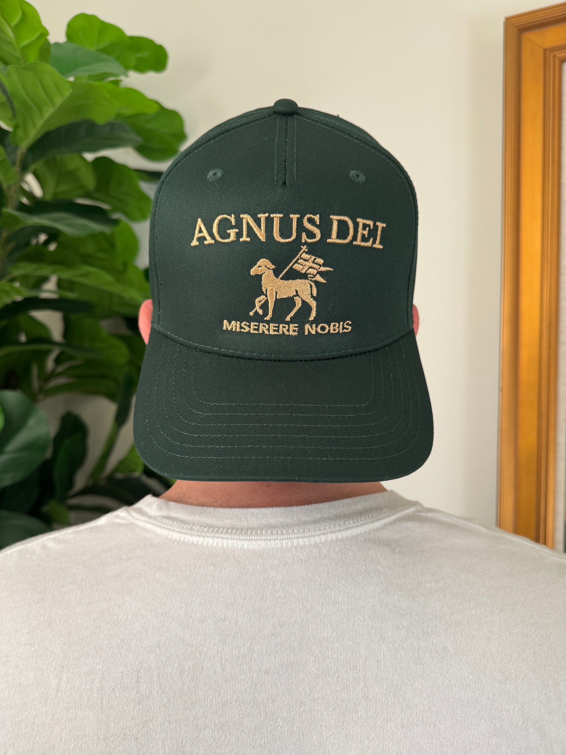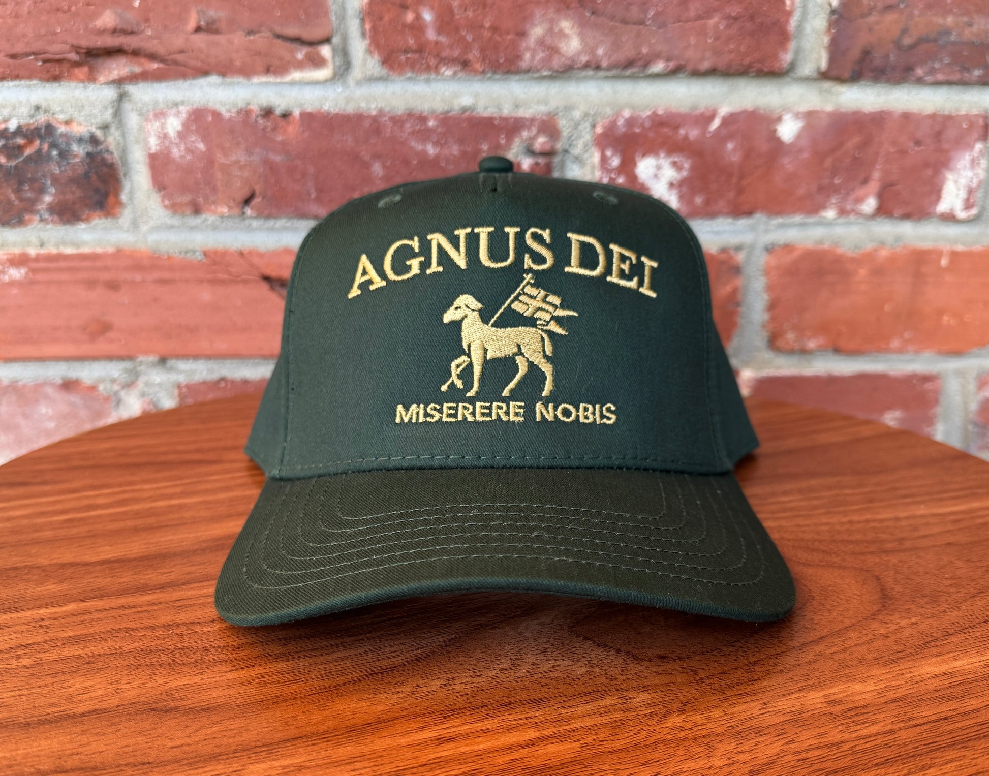 A reverent tribute to the Lamb of God. This hunter-green snapback showcases gold embroidery of the Paschal Lamb with Agnus Dei and Miserere Nobis. Classic, bold, and deeply symbolic crafted with a structured crown and adjustable snapback for all day comfort.
