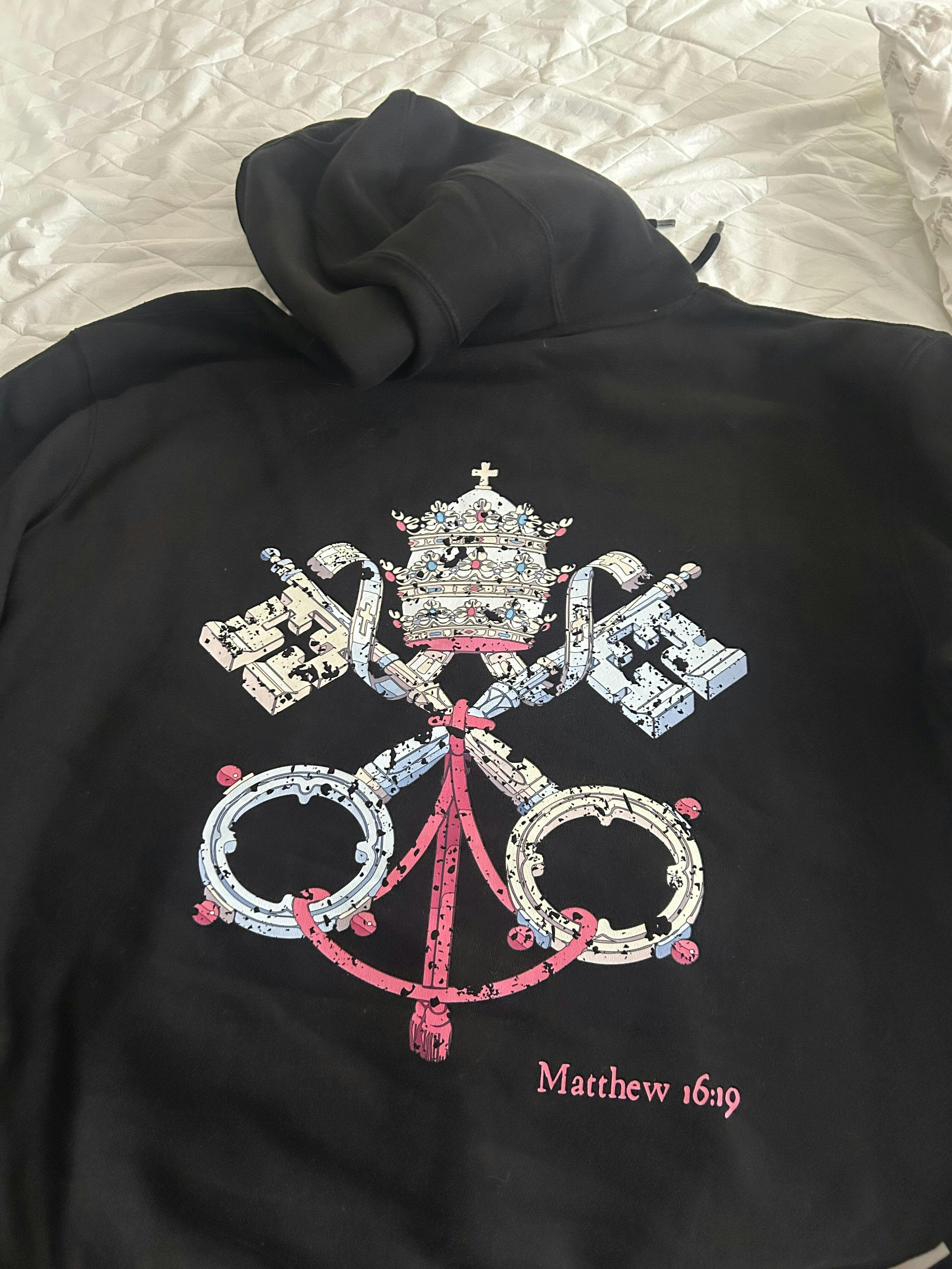 Inspired by Matthew 16:19, the Keys to the Kingdom Hoodie features the Papal Tiara and Crossed Keys — the symbol of the authority Christ gave to Saint Peter and the Church. This design represents faith, leadership, and the unbroken mission of the Catholic Church.